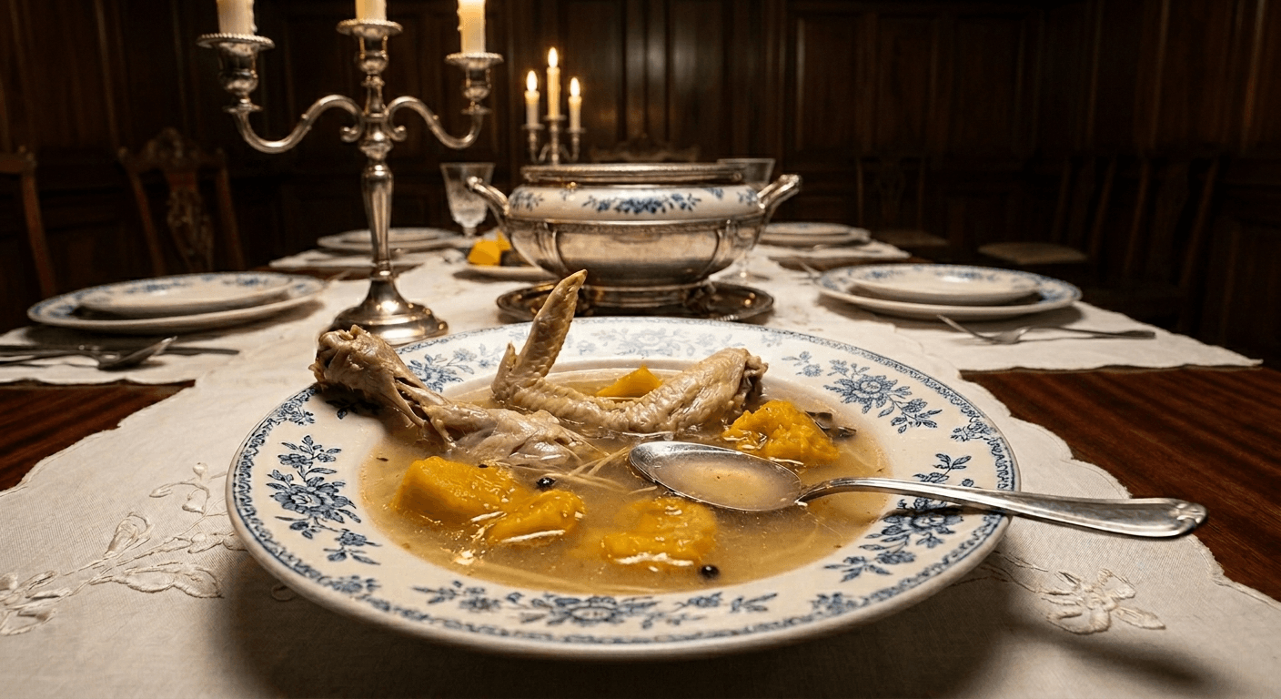 A large steaming tureen was brought in. The Dominican, after muttering the benedicite, to which scarcely any one knew how to respond, began to serve the contents. But whether from carelessness or other cause, Padre Damaso received a plate in which a bare neck and a tough wing of chicken floated about in a large quantity of soup amid lumps of squash, while the others were eating legs and breasts, especially Ibarra, to whose lot fell the second joints. Observing all this, the Franciscan mashed up some pieces of squash, barely tasted the soup, dropped his spoon noisily, and roughly pushed his plate away. The Dominican was very busy talking to the rubicund youth.